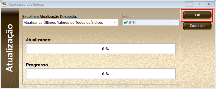 - Ao aparecer a tela de Atualização, mantenha a opção de atualização Atualizar os Últimos Valores de Todos os Índices conforme já selecionado na tela e então clique em Ok.