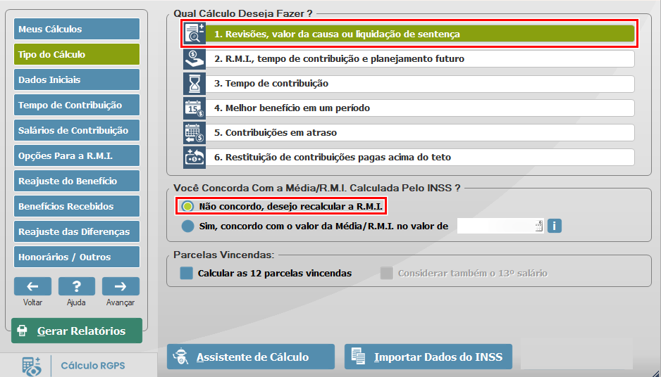 Primeiramente, após criar um cálculo, acesse a tela Tipo do cálculo e selecione a opção 1 - Revisões, valor da causa e liquidação de sentença. Para realizar o cálculo da RMI, selecione abaixo, a opção Não concordo, desejo recalcular o valor da RMI.
