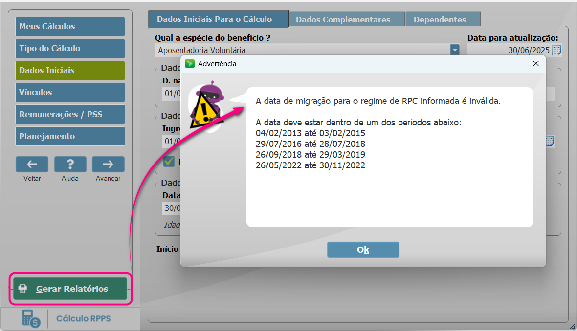 Desse modo, para continuar com o cálculo, é necessário revisar a data digitada na opção "Migração para o regime RPC em" a fim de ficar dentro de um desses períodos.