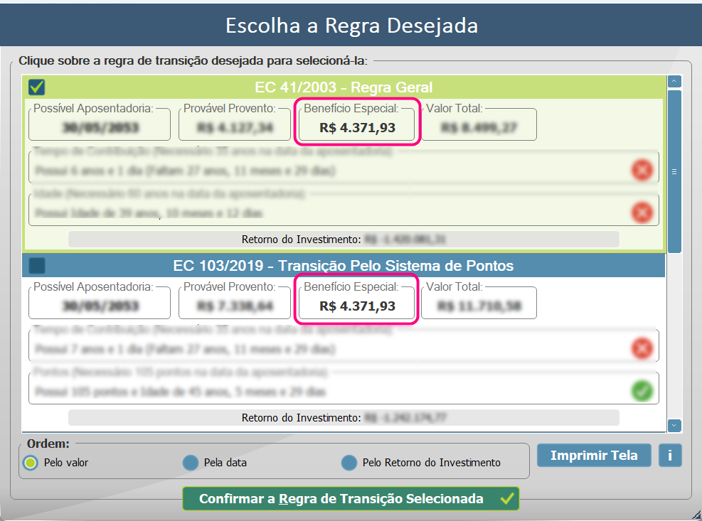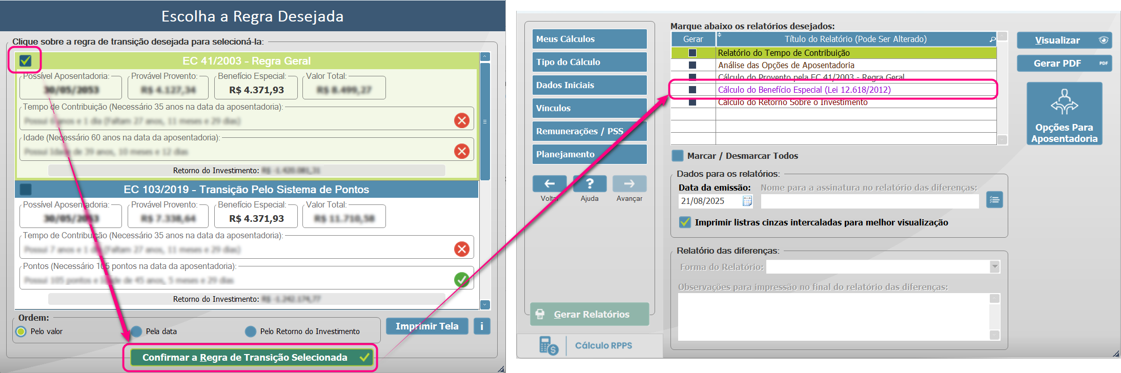 Clicando em "Confirmar a regra de transição selecionada" será possível emitir um relatório específico do cálculo do Benefício Especial.