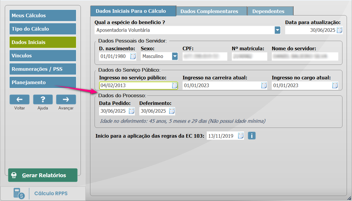IMPORTANTE! Se a opção "Migração para o regime de RPC em" não estiver disponível em seu cálculo, isso indica que a data de ingresso no serviço público está depois de 03/02/2013. Veja no exemplo abaixo.