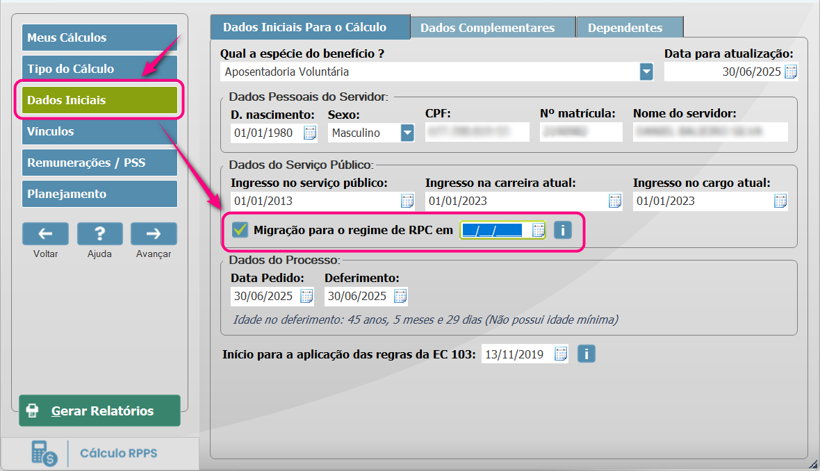 No sistema Prévius 3.0+ para calcular o valor do benefício especial, acesse a tela "Dados Iniciais" e marque a opção "Migração para o regime de RPC em" informando a data que o servidor migrou.